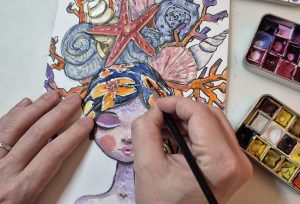 Face au papier, Adrien peint à l’aquarelle comme on écoute. Les couleurs se déposent, se mêlent, parfois résistent, traçant un chemin intérieur nourri par l’Art nouveau, l’univers d’Alfons Mucha, les figures féminines intemporelles et la présence florale, délicate et enveloppante. Chaque composition cherche un point d’accord entre précision et fragilité. Chaque aquarelle est conçue comme une porte entrouverte sur un jardin secret. On y perçoit le bruissement des pétales, le froissement des nuits claires, la promesse des matins neufs. Ces œuvres proposent une expérience sensible, où le regard est invité à ralentir et à entrer dans un dialogue silencieux avec la couleur.